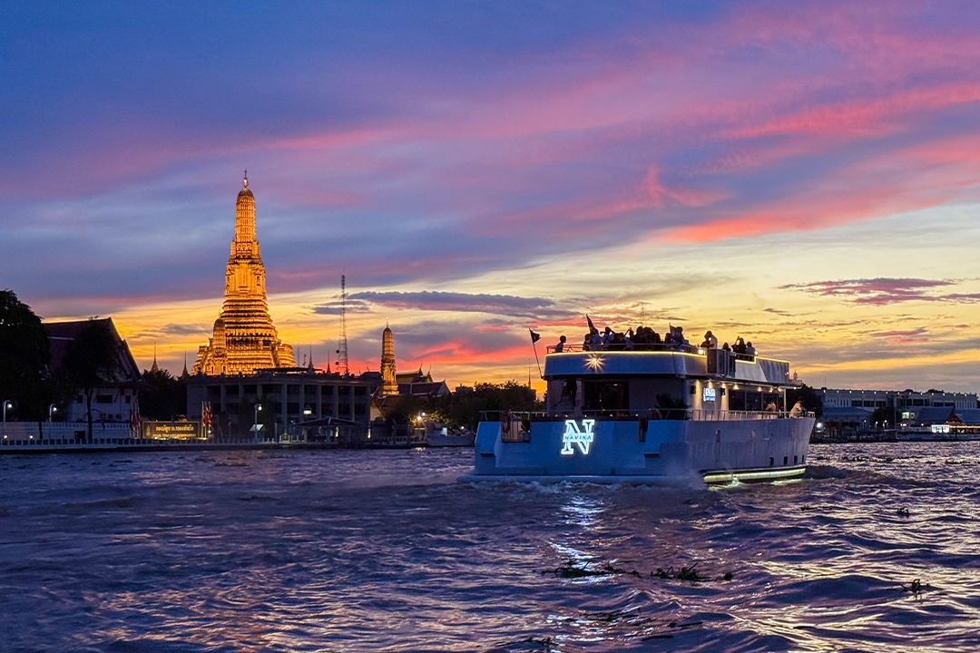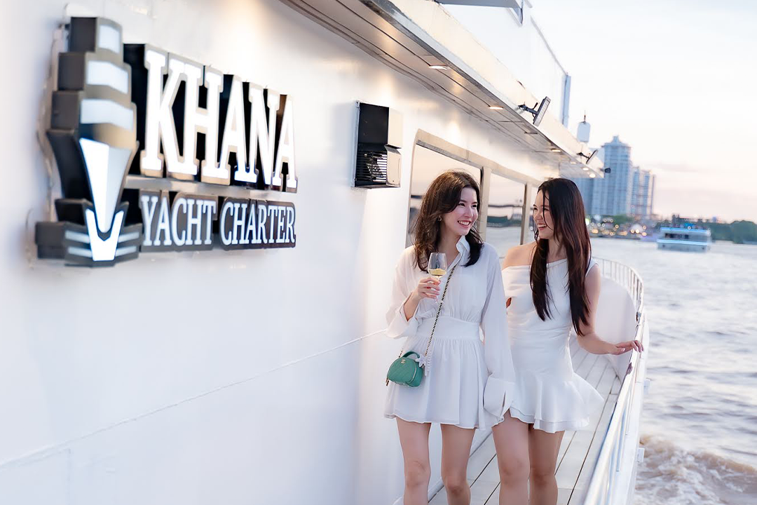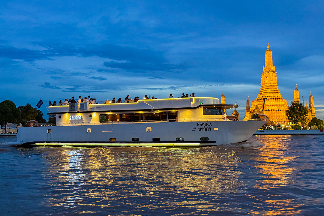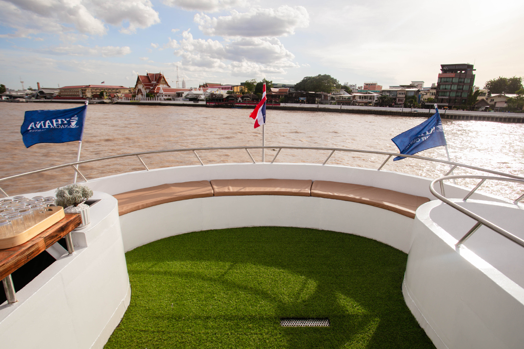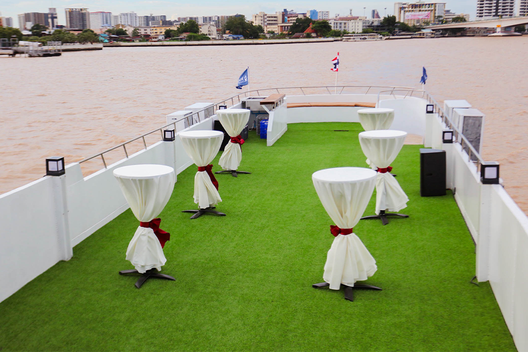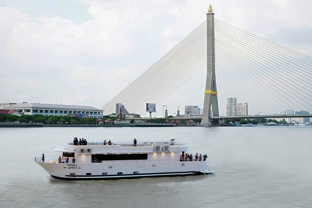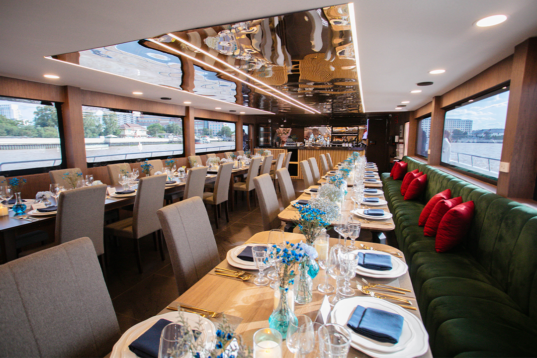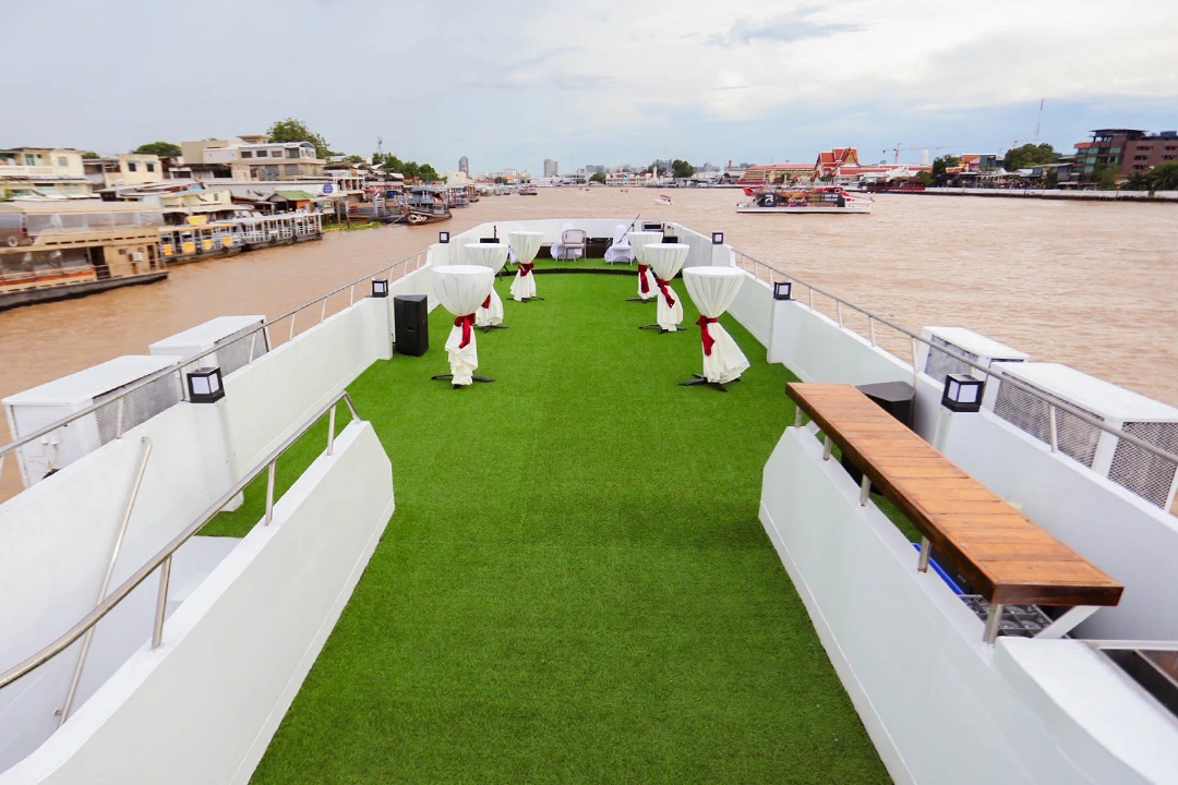 A 90-foot luxury yacht designed for ultimate privacy and comfort, featuring fully equipped spaces including an air-conditioned dining room, full stereo and karaoke system, and a 360-degree panoramic viewing deck. Accommodating up to 50 passengers, it offers a premium atmosphere for every special occasion whether it’s an exciting party, a romantic dinner, or enjoying Bangkok’s vibrant night lights. Immerse yourself in the stunning views of the Chao Phraya River, day or night, in an experience exclusively yours.