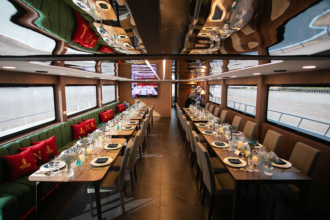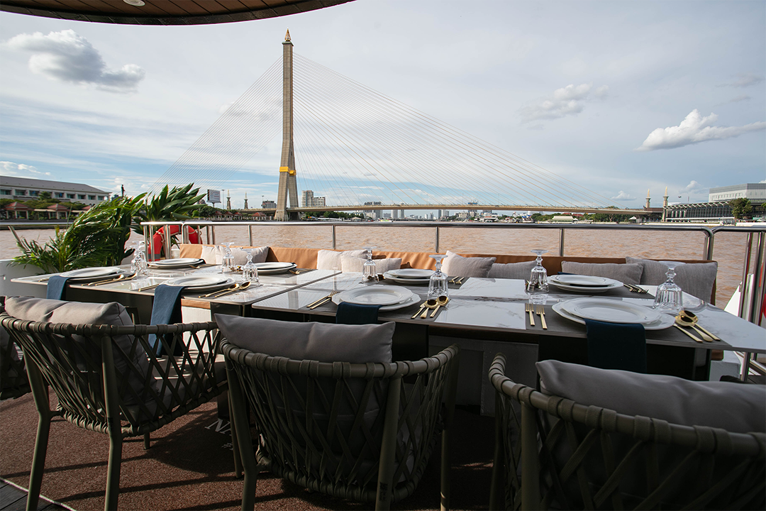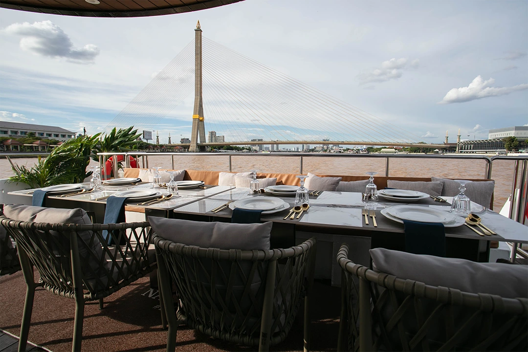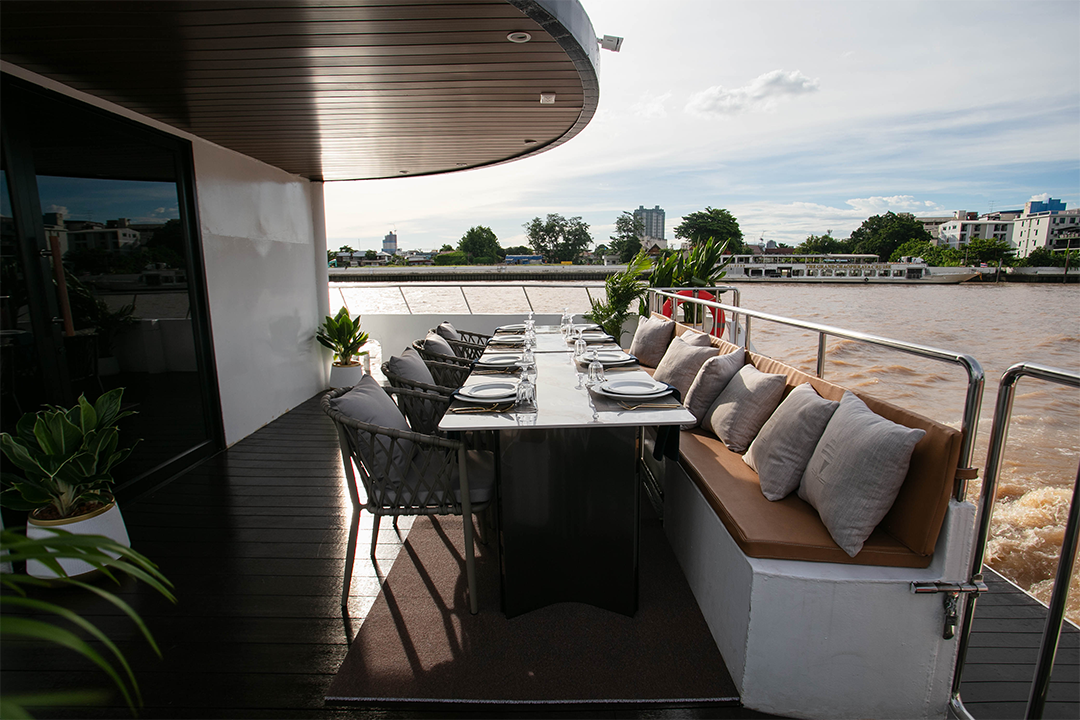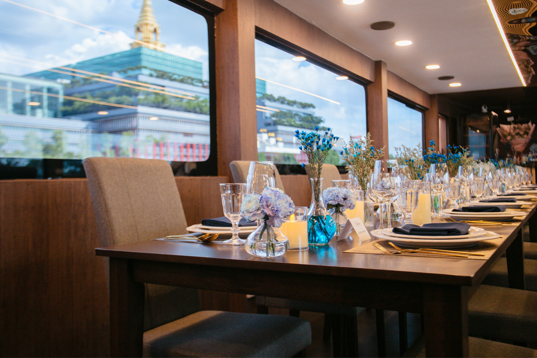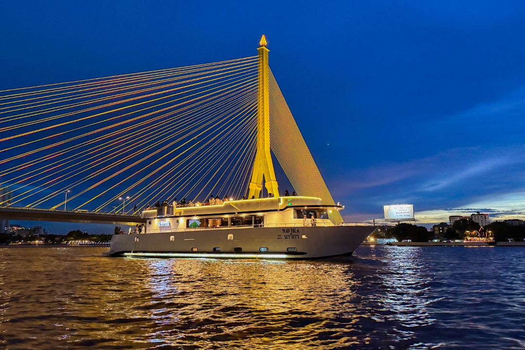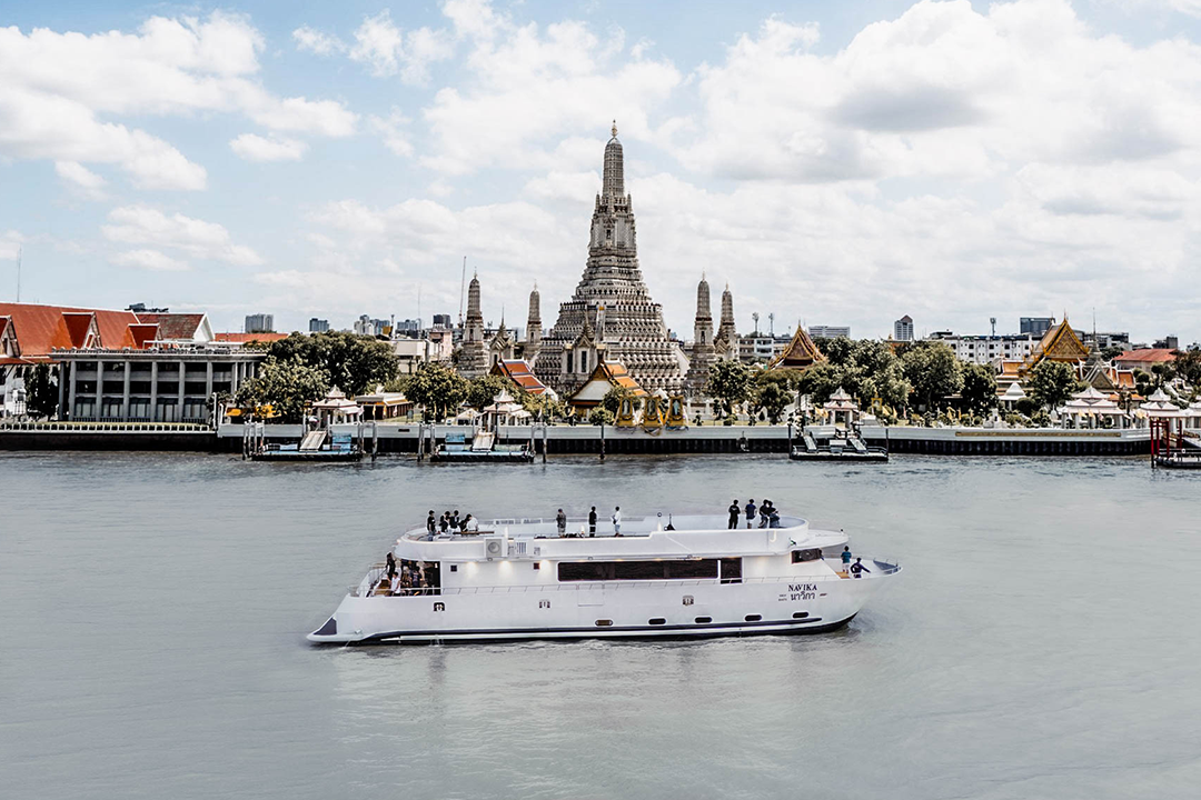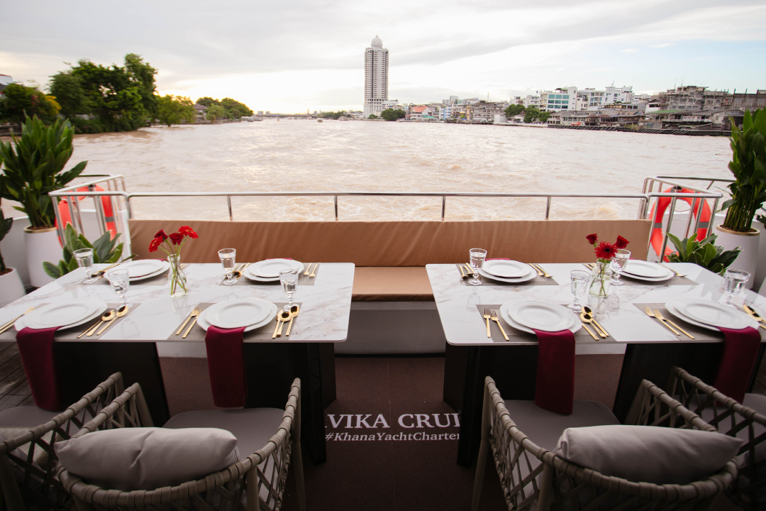 A 90-foot luxury yacht designed for ultimate privacy and comfort, featuring fully equipped spaces including an air-conditioned dining room, full stereo and karaoke system, and a 360-degree panoramic viewing deck. Accommodating up to 50 passengers, it offers a premium atmosphere for every special occasion whether it’s an exciting party, a romantic dinner, or enjoying Bangkok’s vibrant night lights. Immerse yourself in the stunning views of the Chao Phraya River, day or night, in an experience exclusively yours.